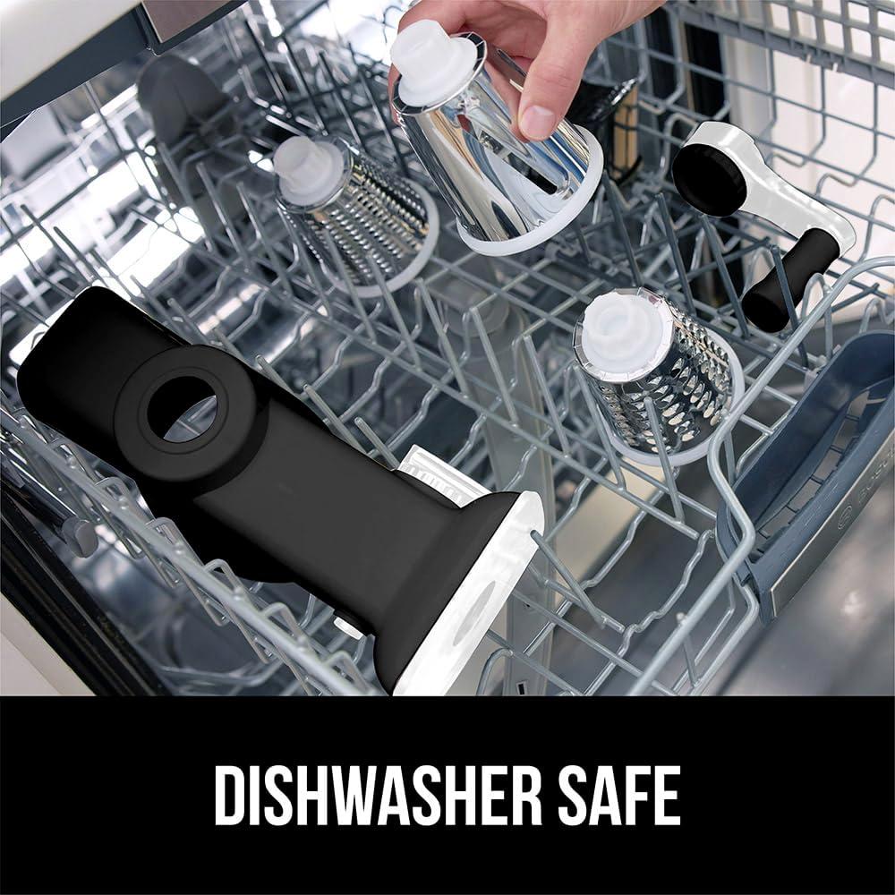 BPA FREE, FOOD GRADE, AND DISHWASHER SAFE: grater is third party tested to be BPA free and food grade; dishwasher safe on the top rack for an easy clean; grater measures 9.3 inches x 4.4 inches; comes with 3 blades, a grater, a food pusher and a cleaning brush for hard to reach spots