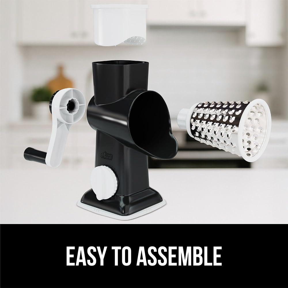 GORILLA GRIP BPA-Free Rotary Cheese Grater Hand Crank, Easy to Set Up, Strong Suction Base for Kitchen Countertop, Shred Potato, Vegetable, Nuts in Seconds, Round Mandoline Slicer, 3 Blades, Black(Black)