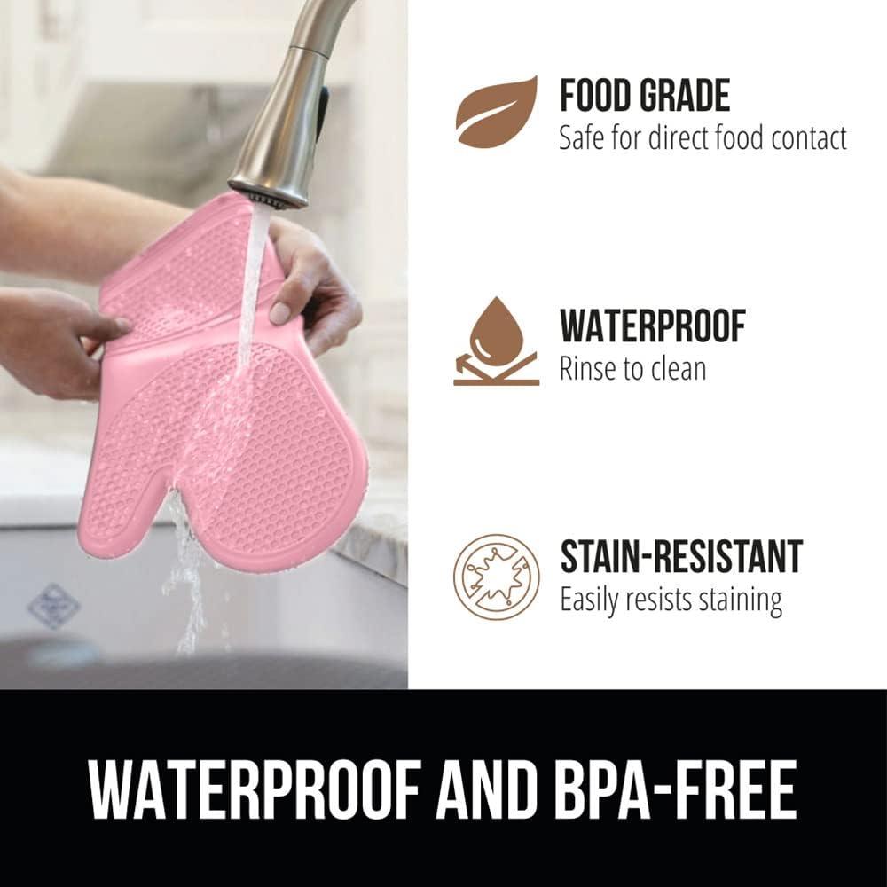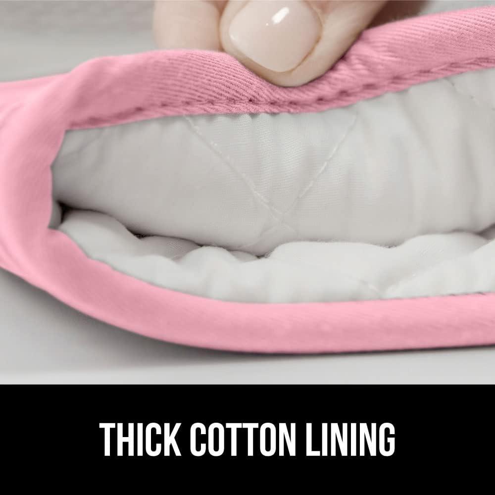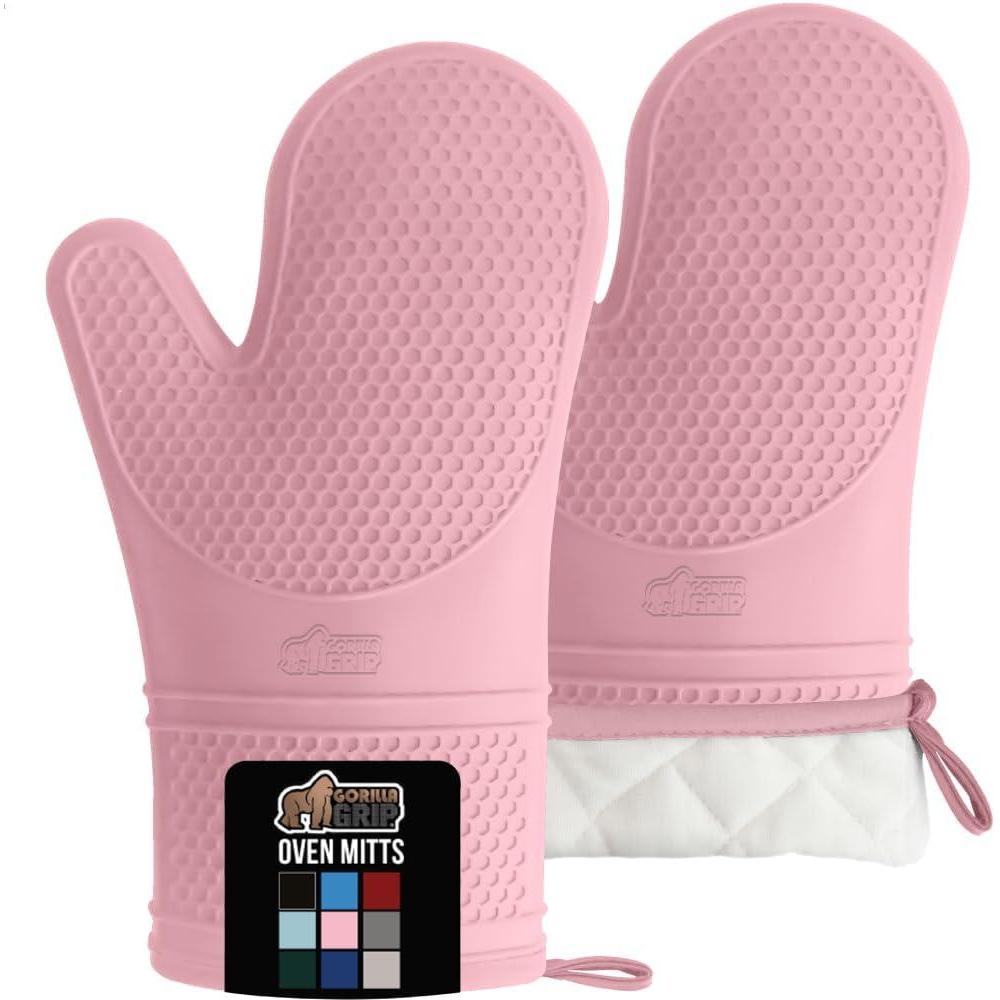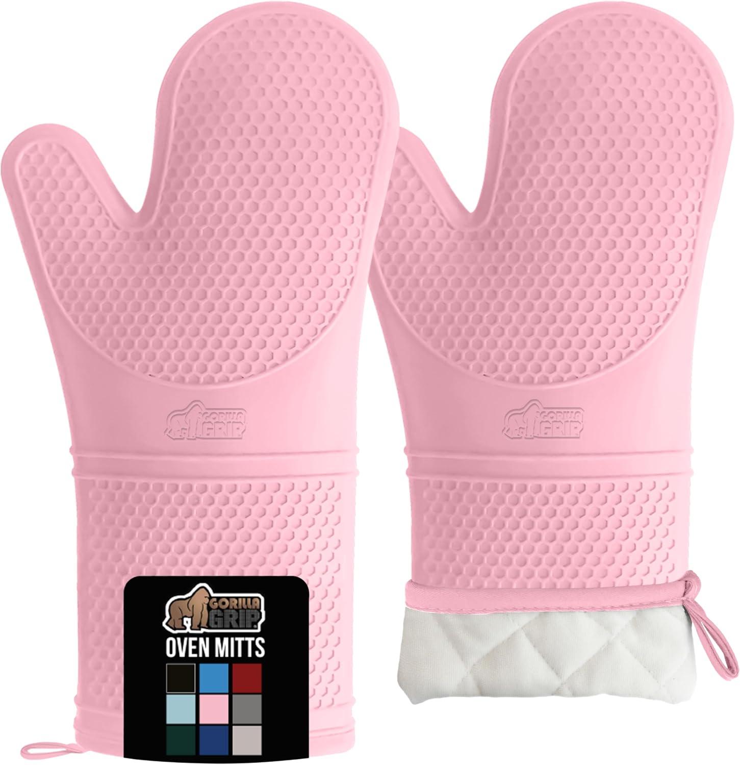 GORILLA GRIP BPA-Free Soft Silicone Oven Mitts, Heat Resistant and Waterproof Cooking Gloves, Thick Cotton Lining, Flexible Gripping for Baking Grilling, Kitchen Potholders Set of 2, 12.5x8.3, White(Pink)