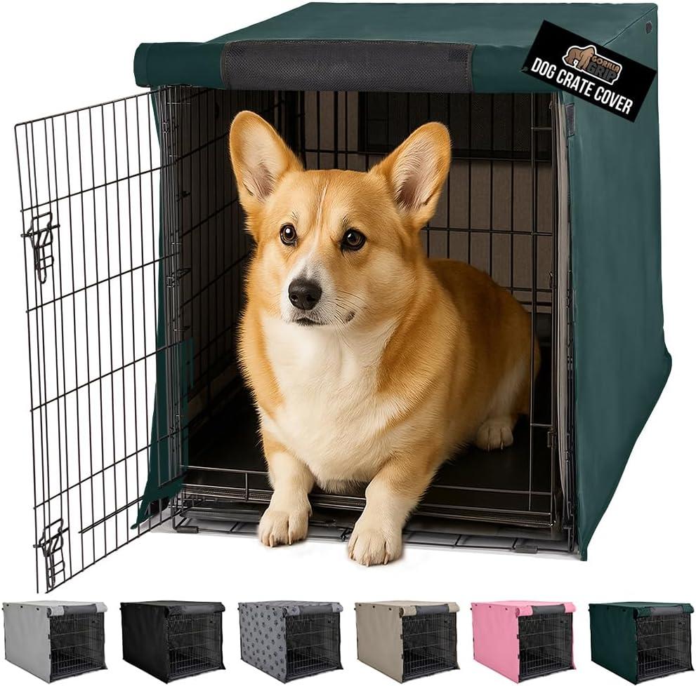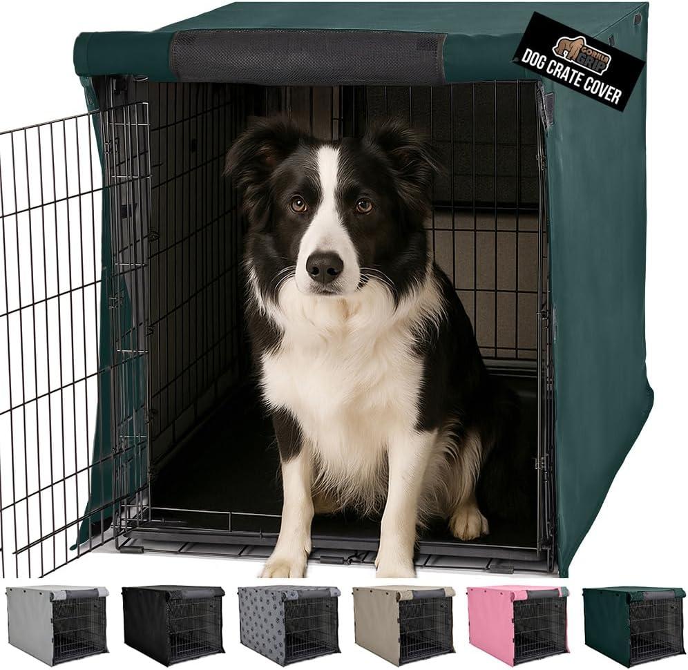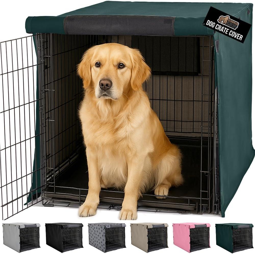 GORILLA GRIP Dog Crate Covers Compatible with Amazon Basics Dog Crates, All Sides Open, Privacy Cover Fits 36″ Wire Kennel, Breathable Mesh Windows, Light Reducing Puppy Training Cage Topper, Black(Hunter Green)