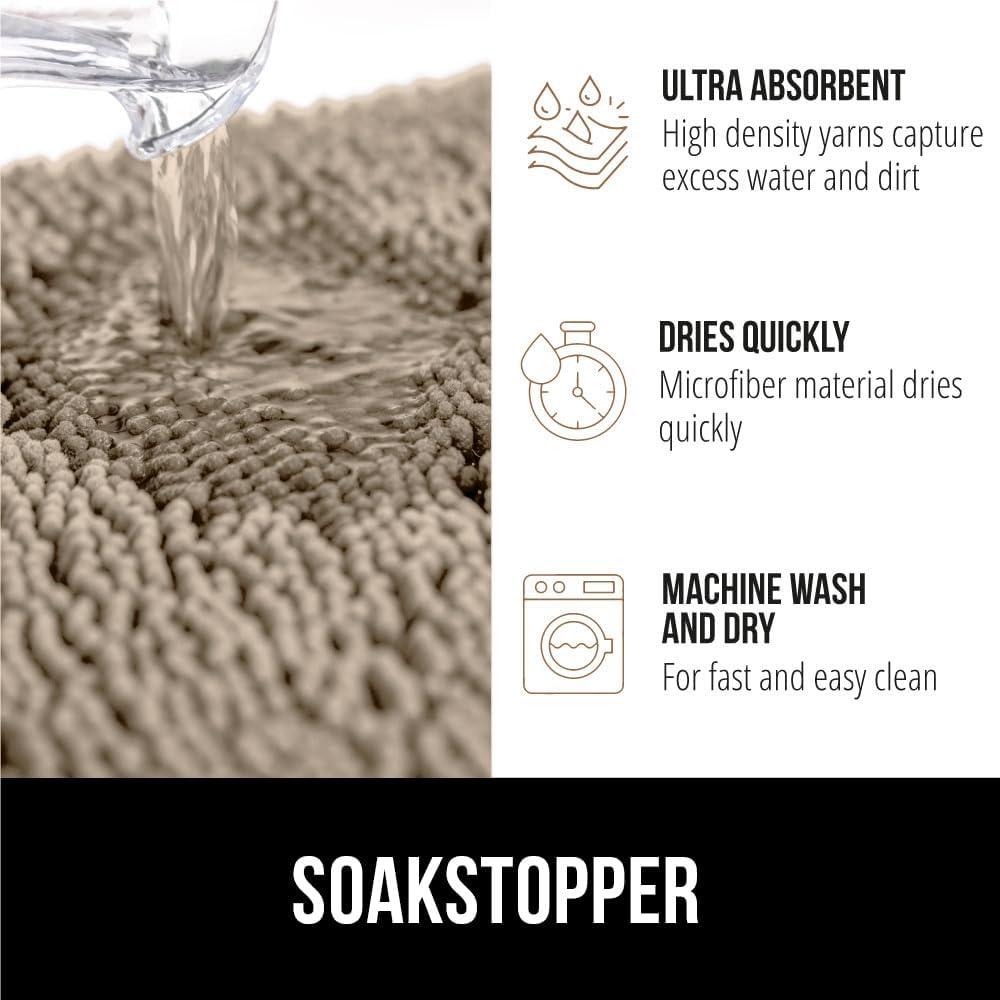 SOAK STOPPER from GORILLA GRIP: the original Gorilla Grip Soak Stopper mat is highly absorbent, featuring an extra-absorbent top layer, its dense chenille pile absorbs excess moisture, helping to keep floors clean from the toughest messes