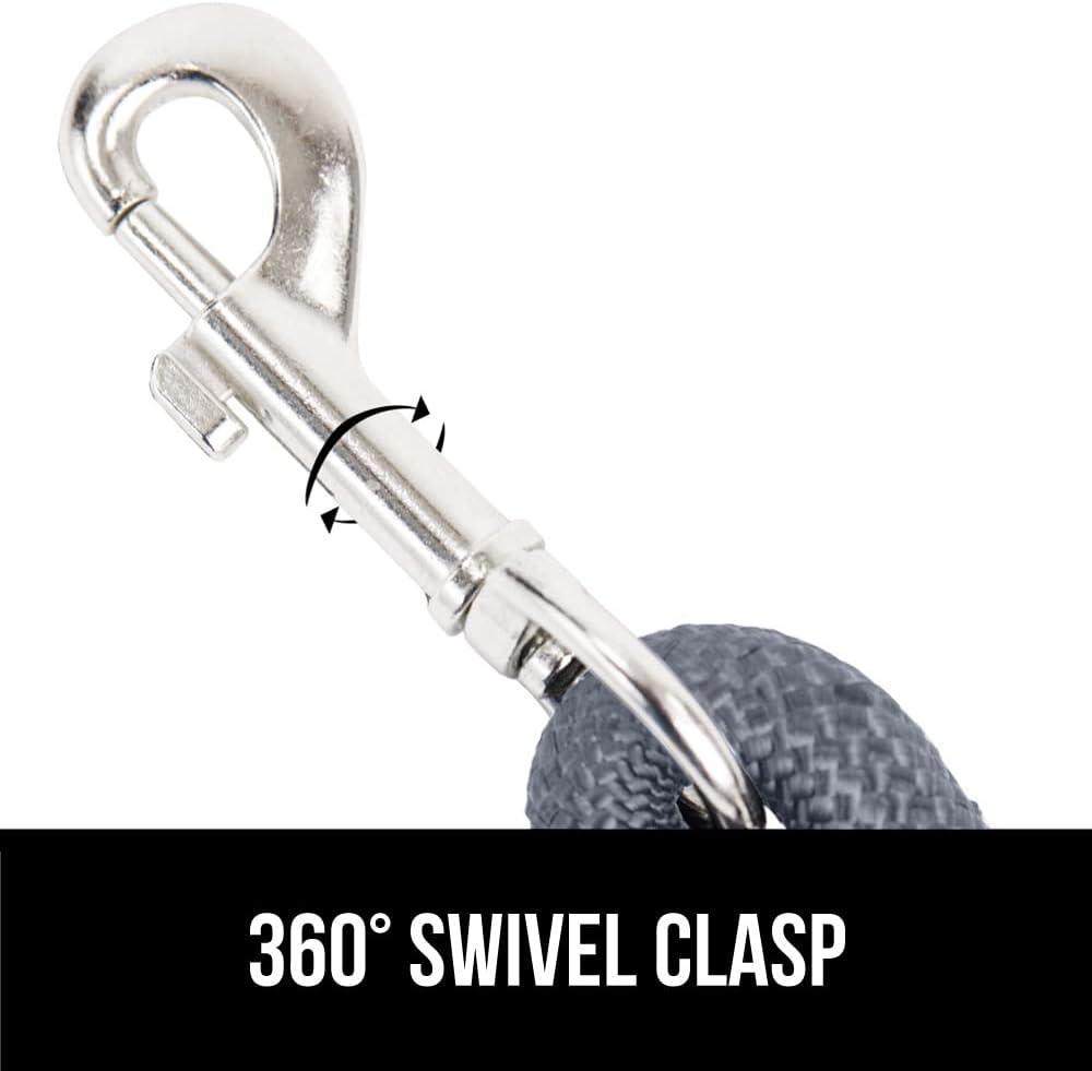 DURABLE LONG LASTING CONSTRUCTION: constructed from thick nylon rope, the Gorilla Grip leash is built to last; nylon material is lightweight and flexible, while remaining tough enough to hold back your pup; the leash features a durable metal clasp with 360 degree swivel capability and can easily clip onto collars and harnesses; additional joint cover reinforces the leashes strength