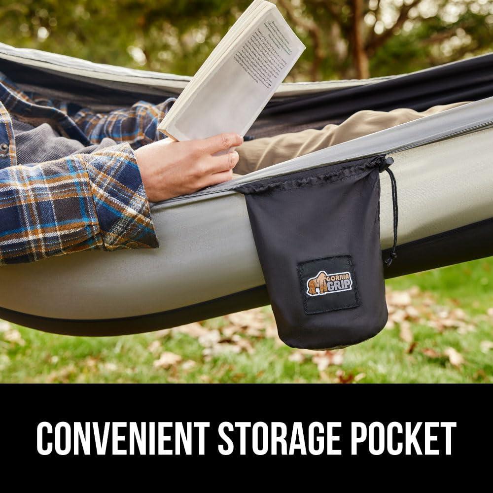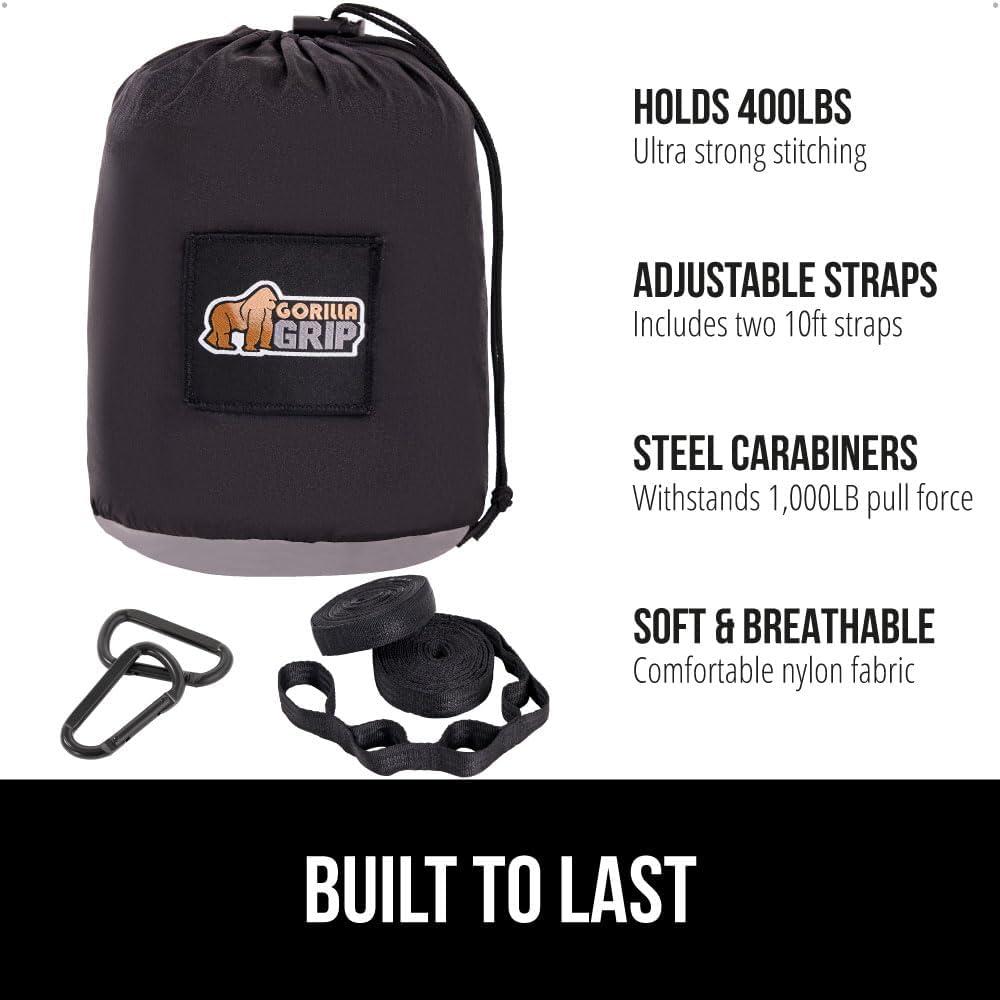 GORILLA GRIP Durable Portable Camping Hammock, Holds 400lbs with Heavy Duty Tree Straps, Comfortable Travel Swing, Camp Hammocks, Easy to Use and Install, Outdoor Essentials, Black, 9x4.5 FT(Black/Grey)