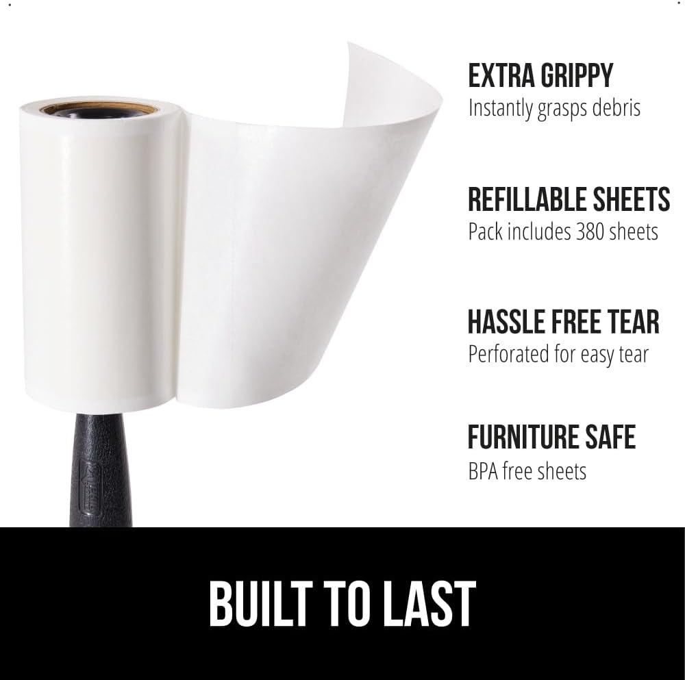 380 REFILLABLE SHEETS: each pack includes 95 sheets per roll and two refills for easy continual use; roller measures at 8.5 inches x 2.5 inches x 2.5 inches; includes 2 lint roller handles and 2 refill rolls.