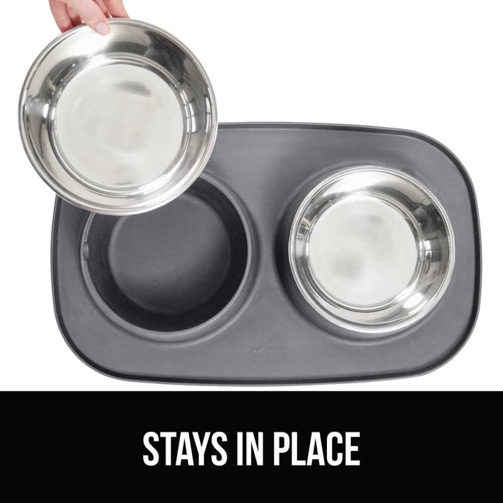 GORILLA GRIP Feeding Mat Set, Patent Pending 100% Waterproof BPA Free Silicone, Stainless Steel Cat and Dog Bowls, Slip Resistant, High Edges Catch Water Food, US Designed Pet Accessories, 1 Cup Gray(Gray)