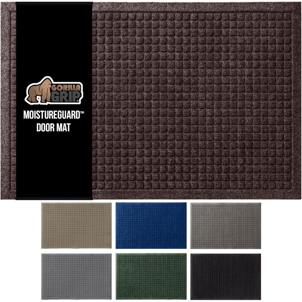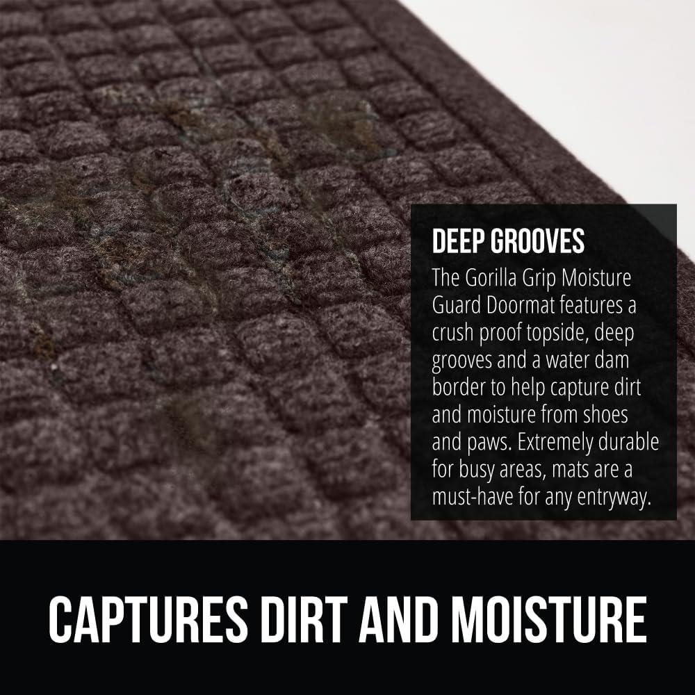 ULTRA ABSORBENT MOISTURE GUARD DOORMAT: our most absorbent doormat, the Gorilla Grip Moisture Guard mat can absorb up to 1.7 cups of water; featuring an innovative water dam border with deep grooves and bi level design to help capture water and prevent excess moisture from spilling onto your floor; ultra soft, polyester topside absorbs more water than other materials