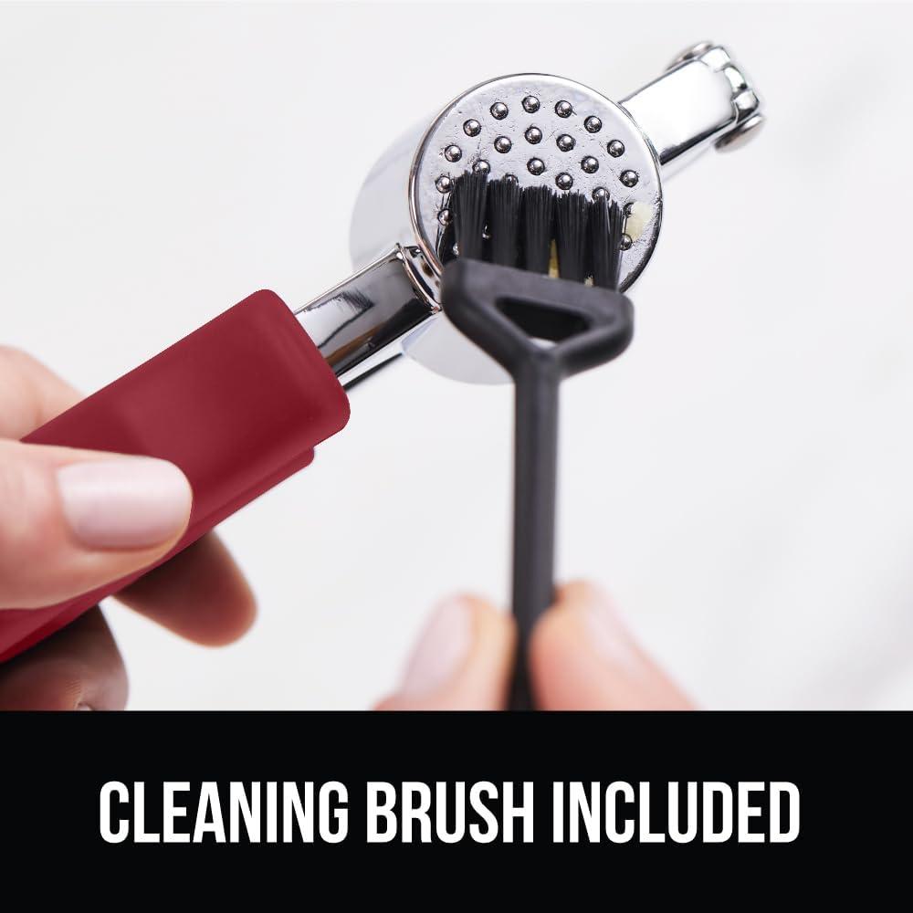 FOR GARLIC, GINGER, PEPPERCORNS, NUTS, AND SEEDS: for more than just garlic; this garlic press is perfect for any recipe that calls for fresh cracked or coarsely ground ingredients; use for ginger, peppercorns, small nuts, and seeds; press measures 6.8″ x 2″ x 1.4″, roller measures 5.1″ x 1.3″; cleaning brush measures 4.3″ x 1″