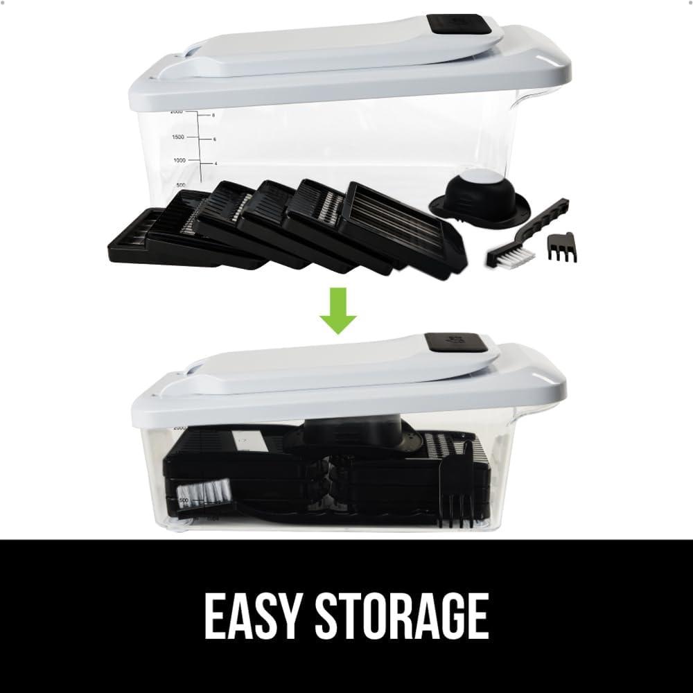 OVERSIZED 2 LITER SELF STORING CONTAINER: conveniently collect prepared foods into the oversized 2 liter collection container; container is 20-65% larger than most brands and measures 11.6 by 5.4 by 4.7 inches; parts can be stored inside container when not in use to save space