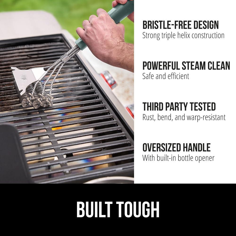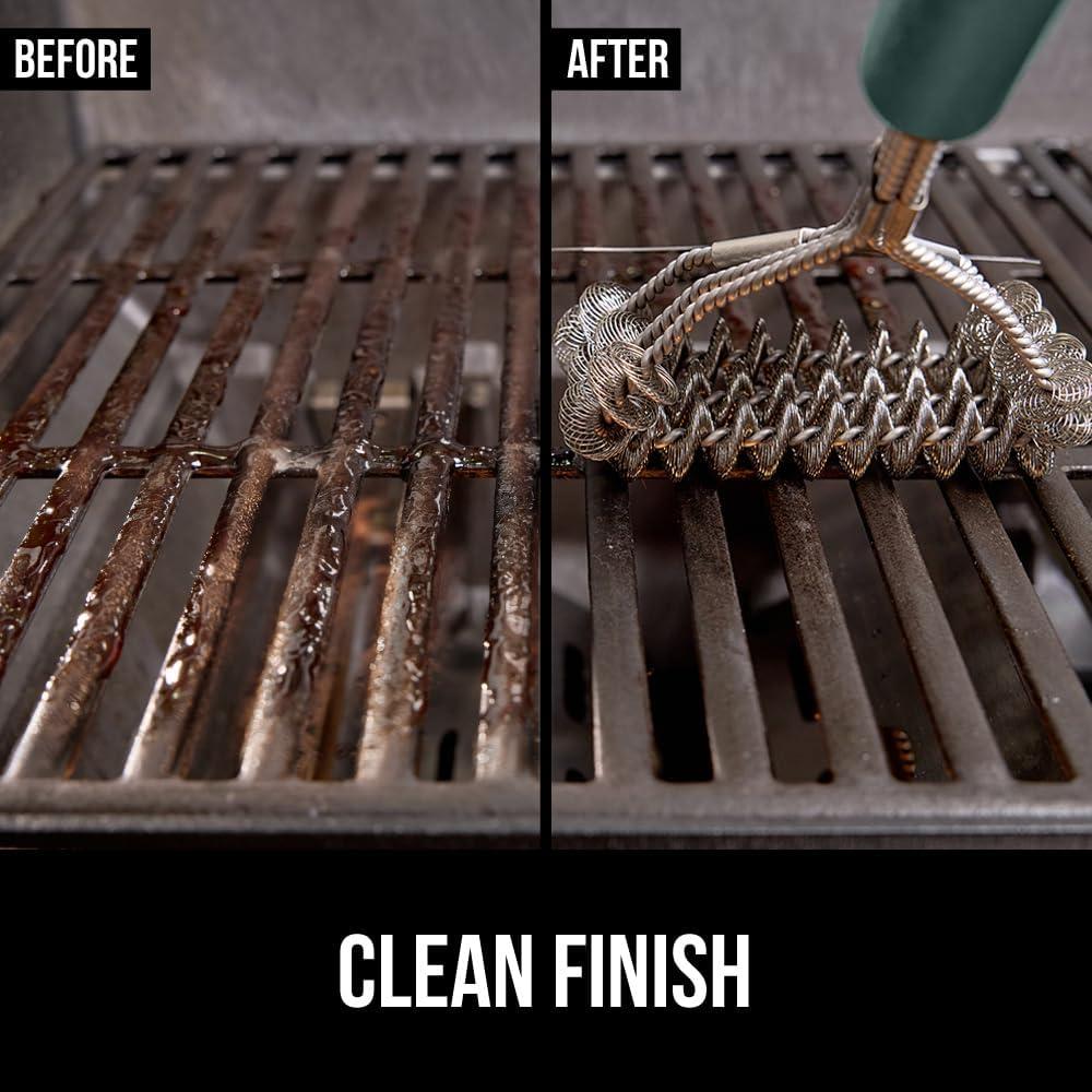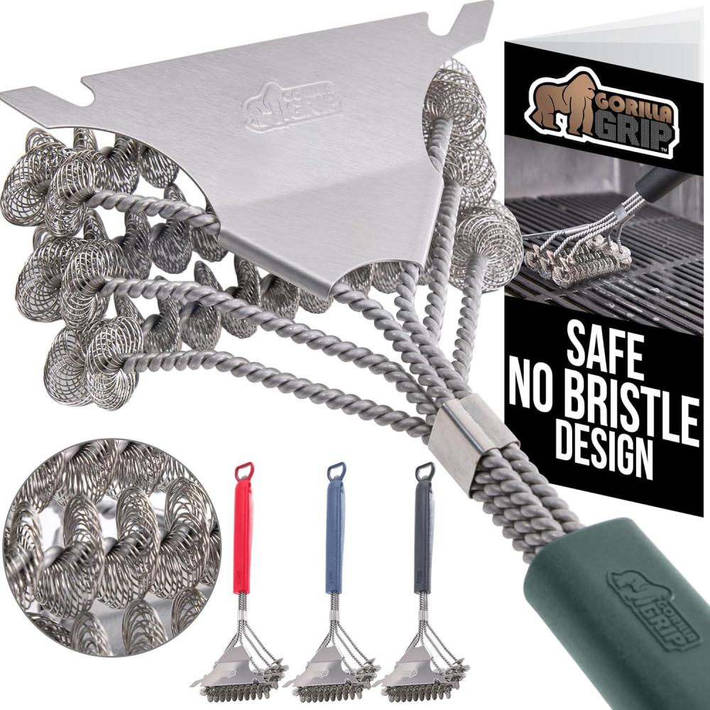 SAFE, NO BRISTLE, TRIPLE LAYER HELIX DESIGN: unlike other brands who use bristles, the Gorilla Grip Grill Brush is safe to use with a triple layer coil design; stainless steel coils help eliminate risk of bristles falling onto grill grates for a worry free cleaning experience; strong helix design efficiently cleans off residue better than typical bristle brushes; works on most types of grills