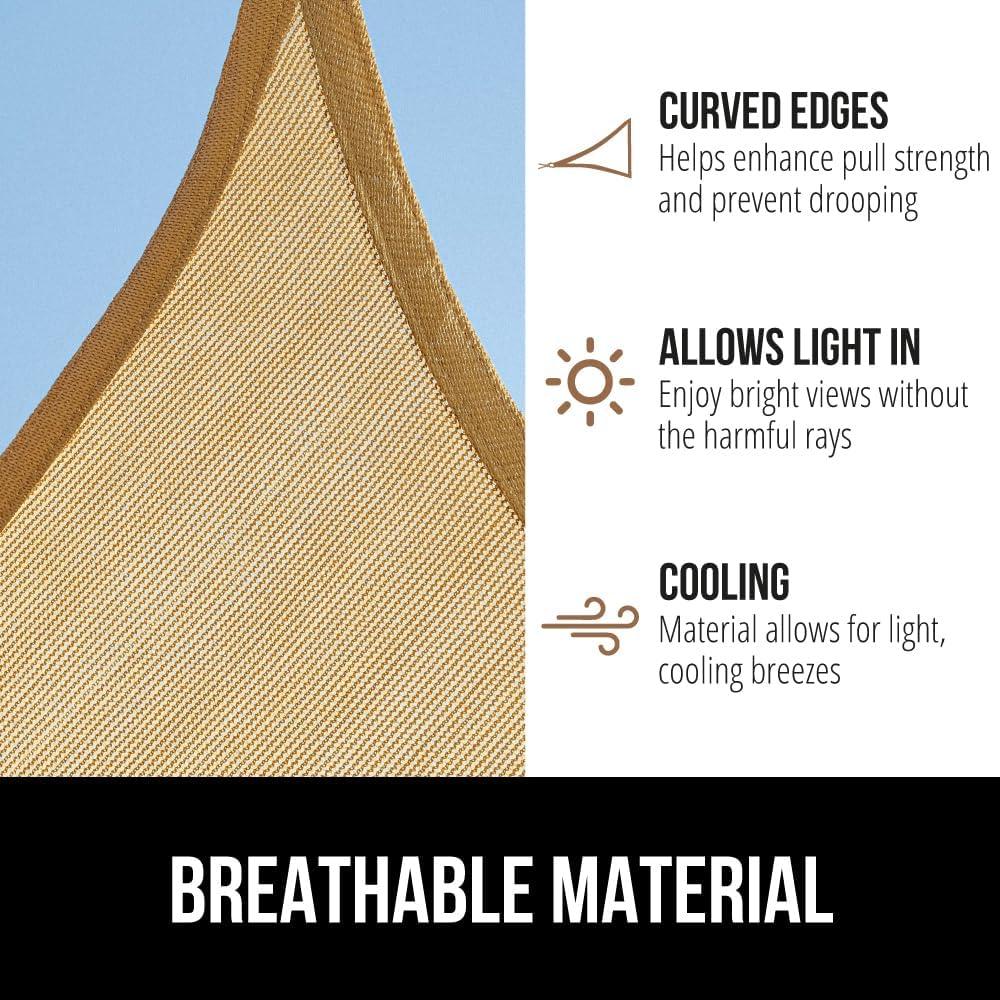 TEAR RESISTANT SEAMS AND CURVED EDGE DESIGN: designed from 185GSM high density polyethylene, shade sail canopies are ultra durable; the double layered, reinforced seams are third party tested to be tear resistant, and the curved edge design helps enhance pull strength and prevent drooping