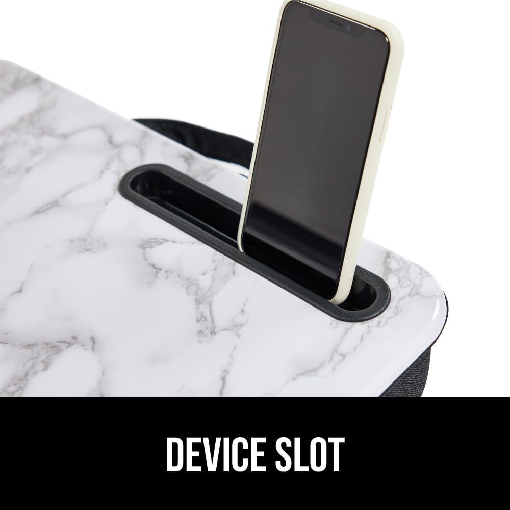 DEVICE SLOT: easily see your phone while you work; lap desk features a 7.5 inch device slot that fits most cellphones and small tablets, so you can keep all your devices within arms reach while you work