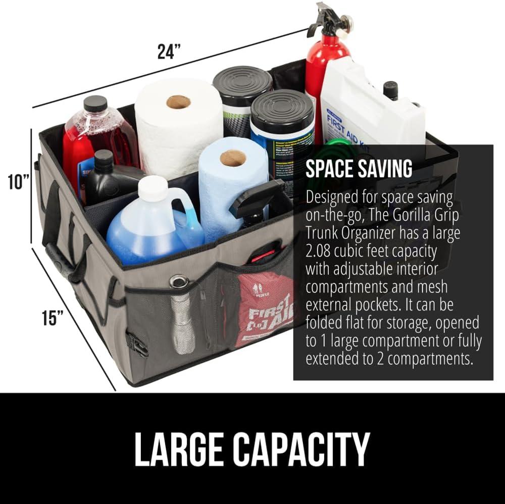 GROCERIES, SPORTING GOODS, TOOLS, SUPPLIES: large capacity 2.08 cubic feet organizer when fully extended measures 24 inches by 15 inches by 10 inches; multiple interior compartments and mesh exterior pockets for easy organization while saving valuable trunk space; a perfect choice for storing groceries, sporting equipment, tools, work supplies and more