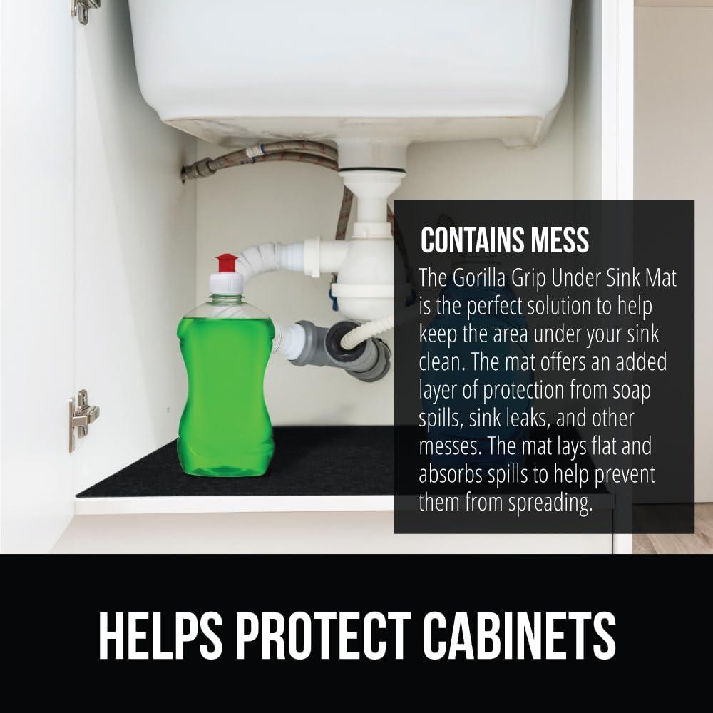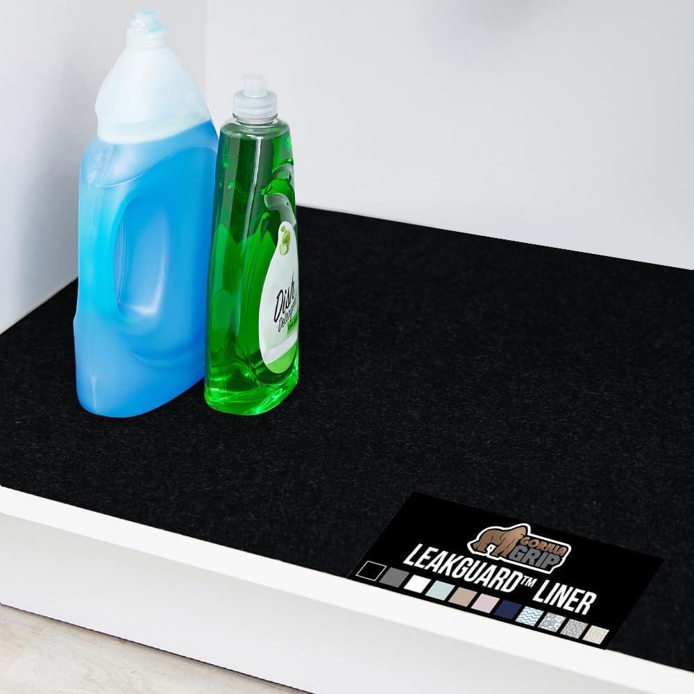 100% WATERPROOF: the Gorilla Grip LeakGuard liner is constructed from ultra thick and absorbent felt fabric on the topside, and a 100 percent waterproof bottom layer, the Gorilla Grip Under Sink Liner is designed to quickly absorb and disperse liquids while providing a strong barrier between liquids and cabinets