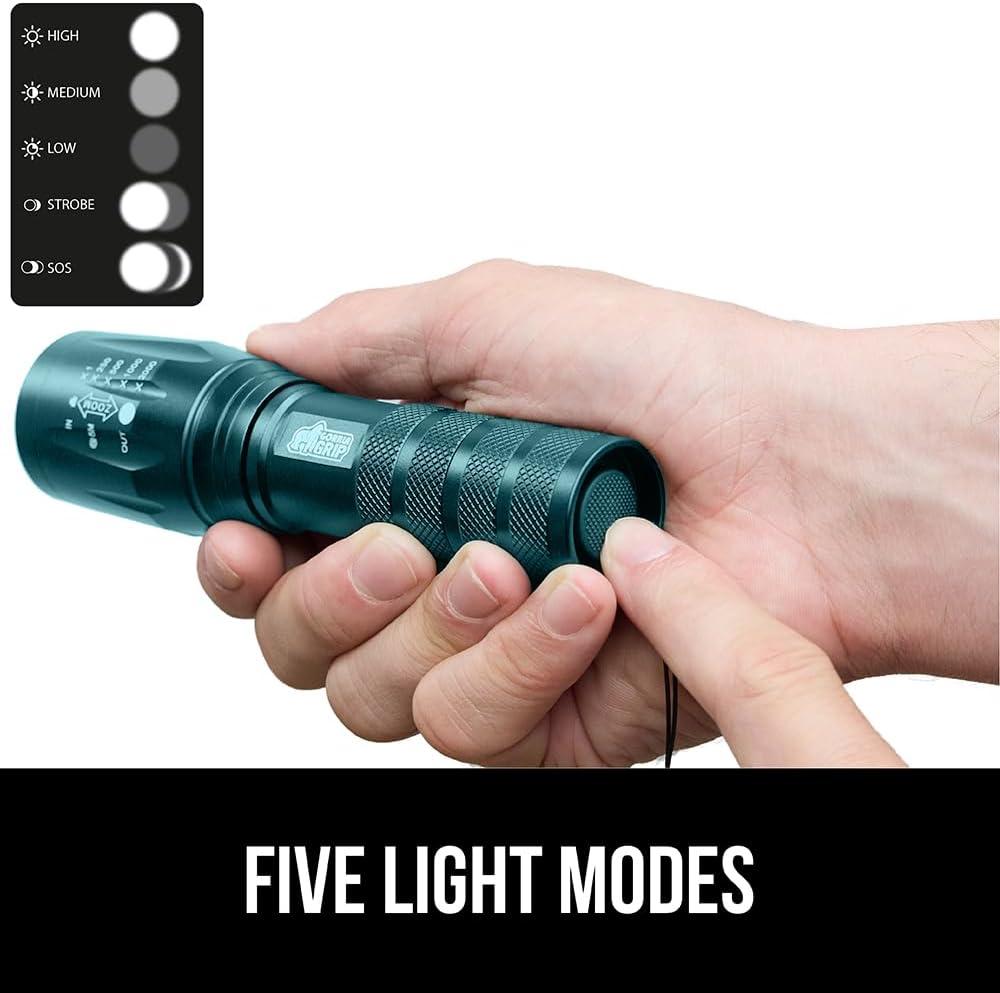 COMPACT DESIGN AND TEXTURED ANTI SLIP HANDLE: measuring 5 inches by 1.5 inches by 1.5 inches, flashlight is light and compact for on the go; ergonomic, anti slip textured handle makes it easy to hold and use