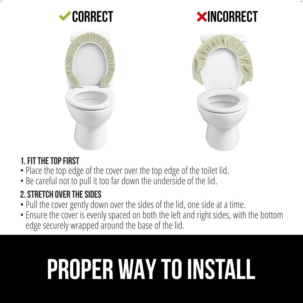FITS MOST TOILET LIDS: generously sized cover measures 19.5 by 18.5 inches and is designed to fit most round and elongated toilet lids; strong elastic edges help cover to adjust to the shape of your toilet lid for a secure fit; elongated seat lids may require additional effort during installation