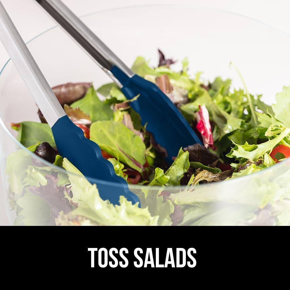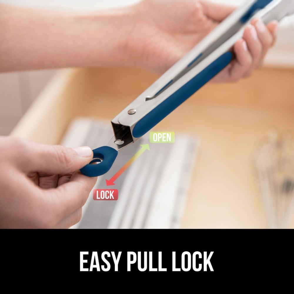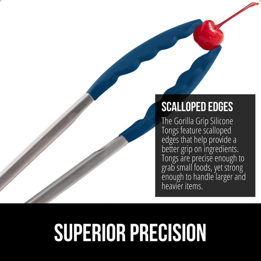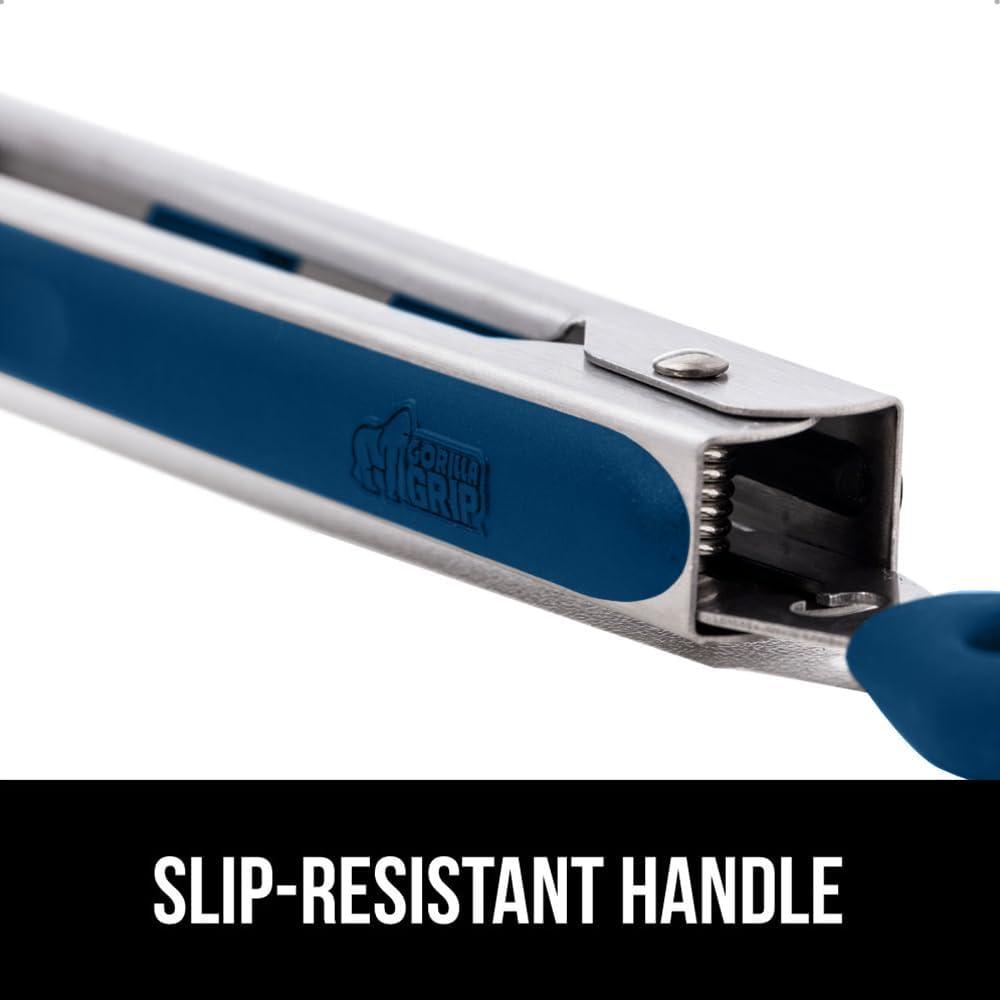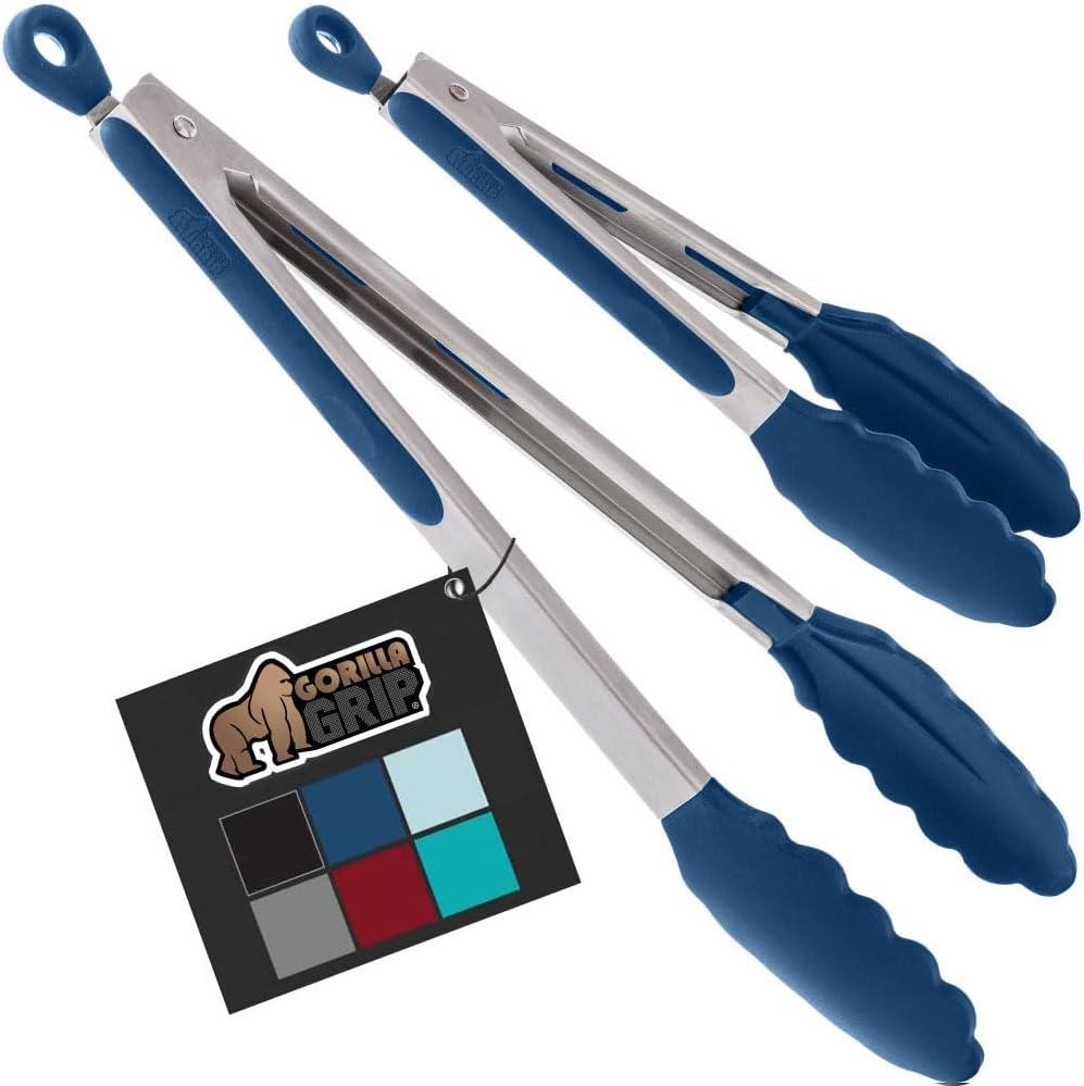 GORILLA GRIP Stainless Steel Heat Resistant Kitchen Tongs for Cooking, 12 + 14 Inch Set of 2 BBQ Tong, Non Scratch Silicone Tip for Pan, Strong Grip, Grab Food, Toss Salad, Air Fryer, Pull Lock, Black(Blue)