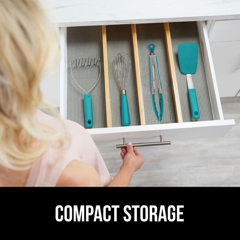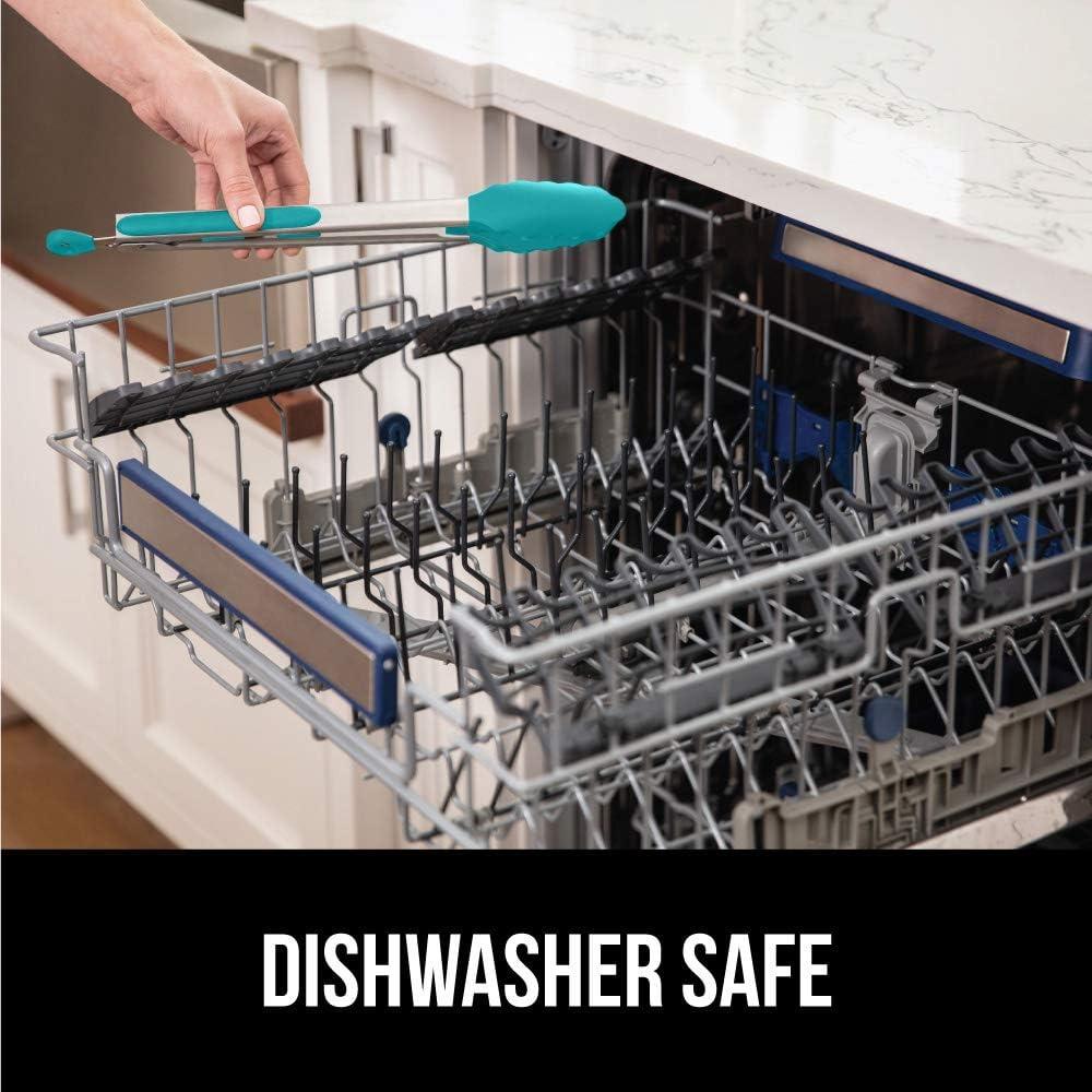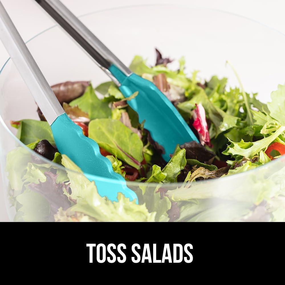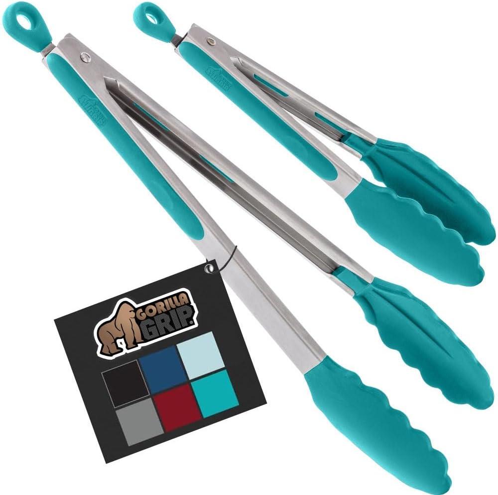 GORILLA GRIP Stainless Steel Heat Resistant Kitchen Tongs for Cooking, 12 + 14 Inch Set of 2 BBQ Tong, Non Scratch Silicone Tip for Pan, Strong Grip, Grab Food, Toss Salad, Air Fryer, Pull Lock, Black(Turquoise)
