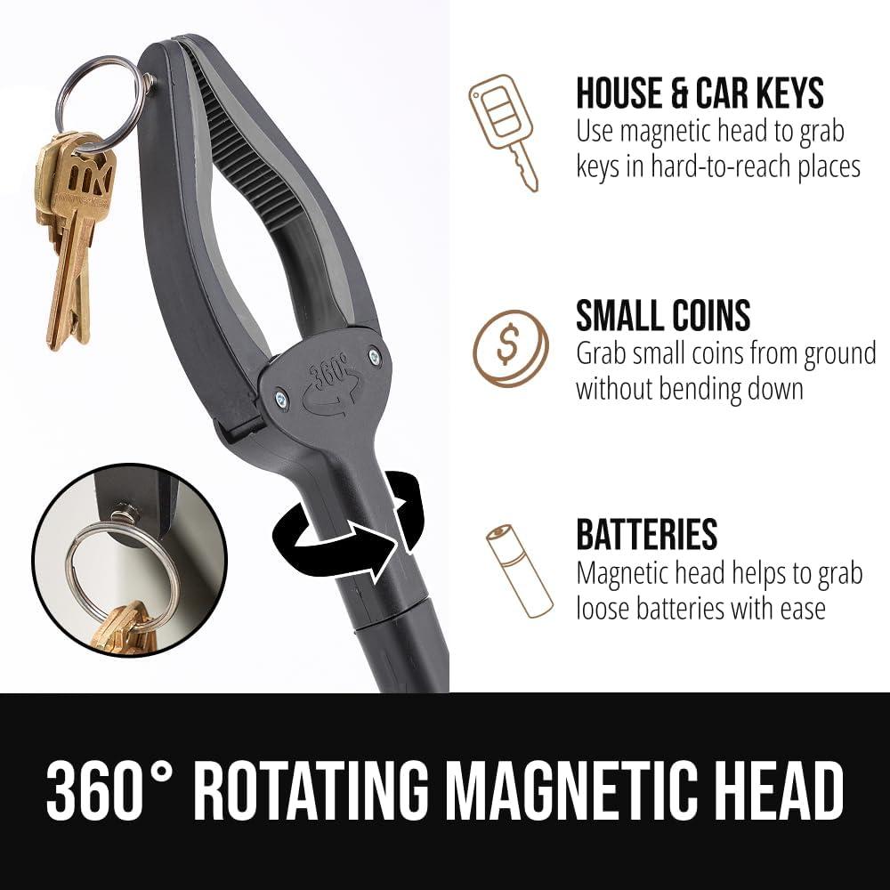 360 DEGREE ROTATING HEAD WITH BUILT-IN MAGNET: 360 degree rotating head helps you to grab items from any angle; reacher tool has built in magnet that easily picks up small metal objects like coins, nails, or batteries; ideal for precise, effortless retrieval in hard to reach spots