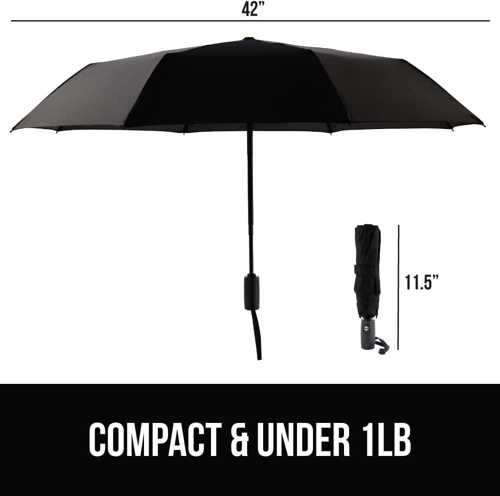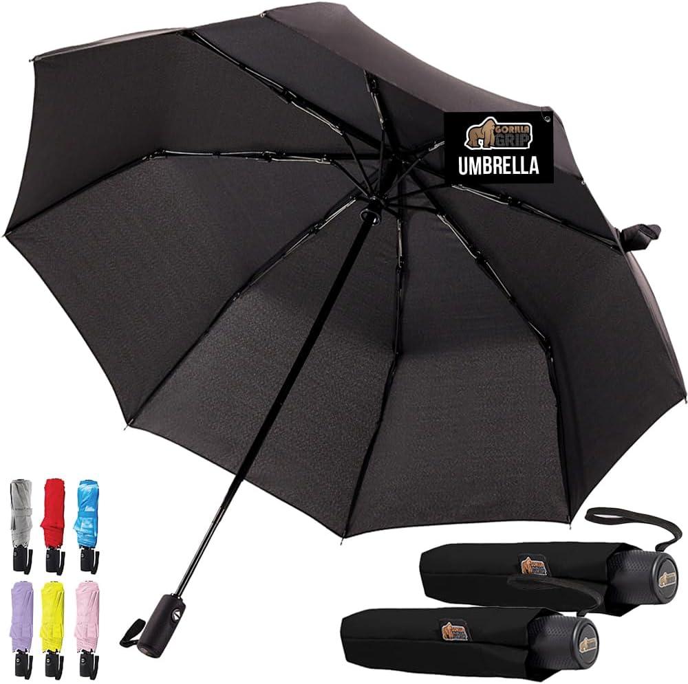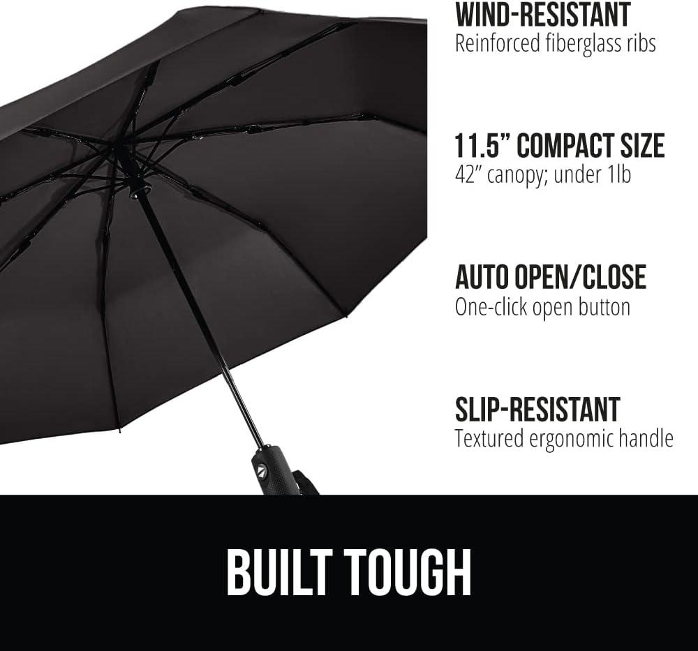 GORILLA GRIP Strong Stick Umbrella for Rain, Compact Travel One-Click Automatic Open Close, Lightweight, Portable, US Designed Reinforced Fiberglass Ribs, Wind Resistant, Easy Collapse, Cats Dogs(Black + Gray)