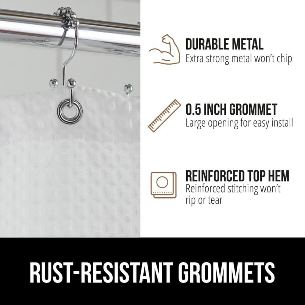 RUST RESISTANT GROMMETS: 12 heavy duty, rust resistant grommets line the top of the shower curtain; opening in grommets allows for the easy installation of shower curtain hooks; does not include hooks