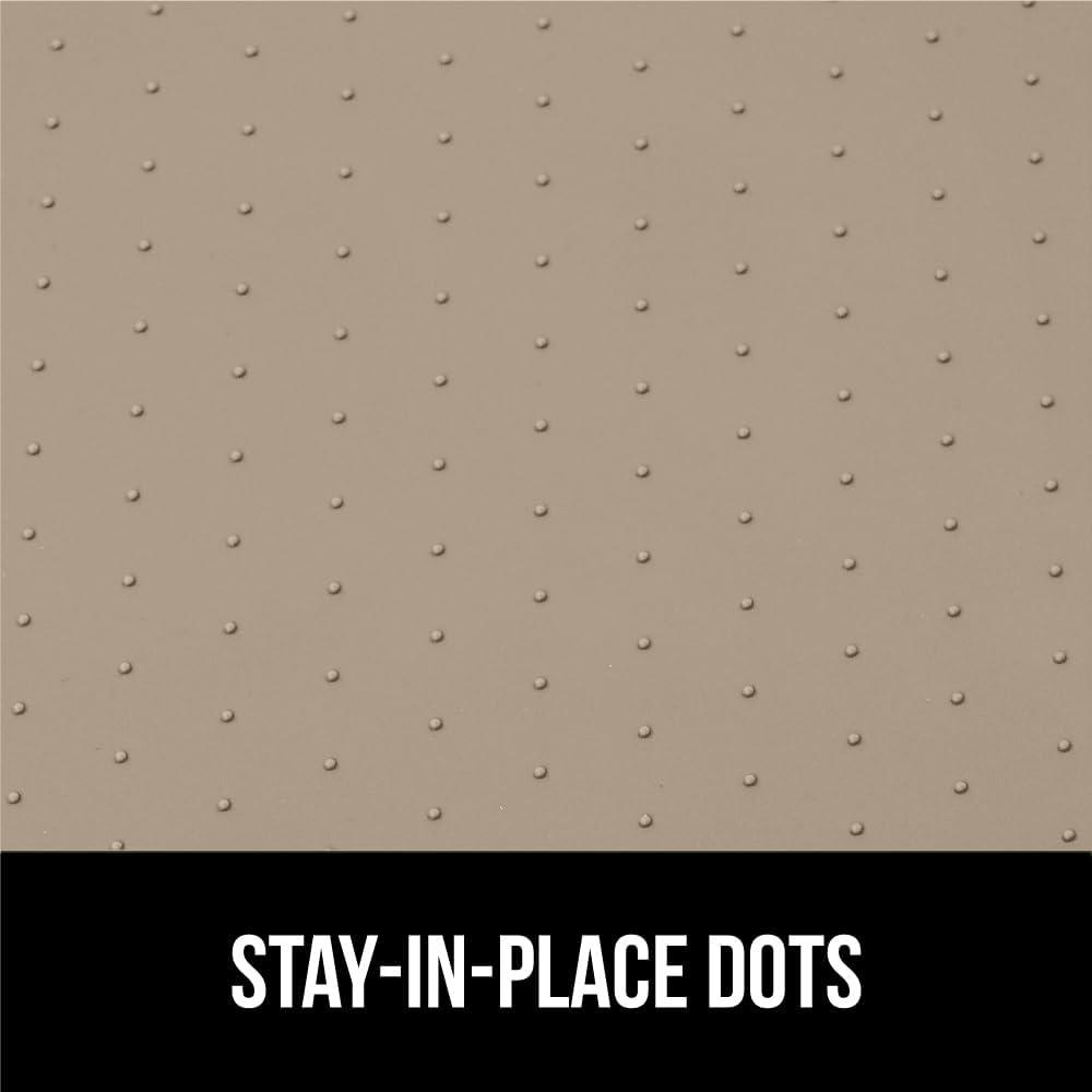STAYS IN PLACE: designed to lay flat and grip your cabinets, mat stays in place with daily use taking items in and out; raised silicone dots on the topside help prevent items from slipping and sliding around the mat